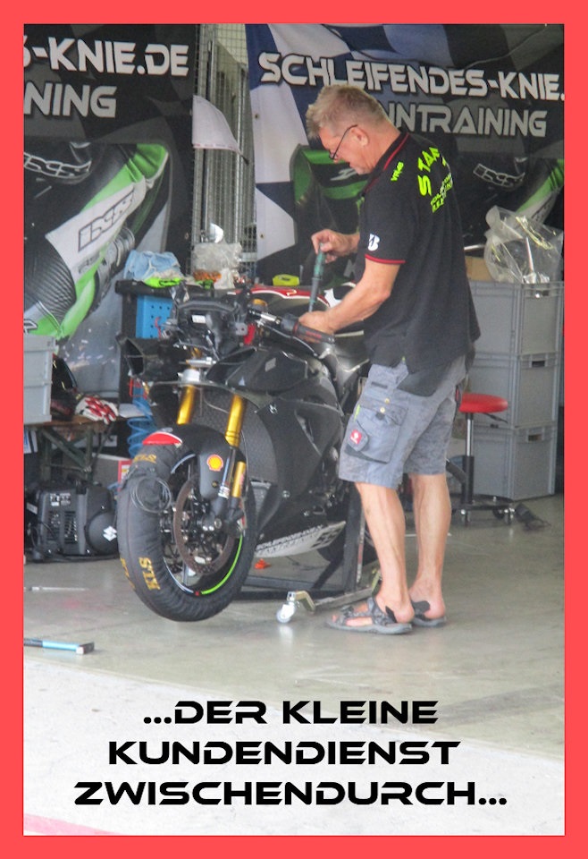 Ebenso machte der Defektteufel an diesem Wochenende extreme Überstunden im Schleiferlager. Alle diese Umstände hatten zur Folge, dass bis zum Abend fünf Schleifer Ihr Rennwochenende bereits frühzeitig beenden mussten, sei es durch Stürze oder durch technisches gebrechen an den Bikes.