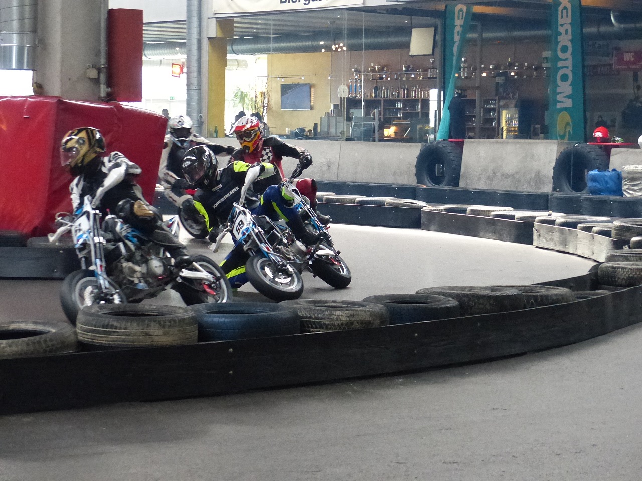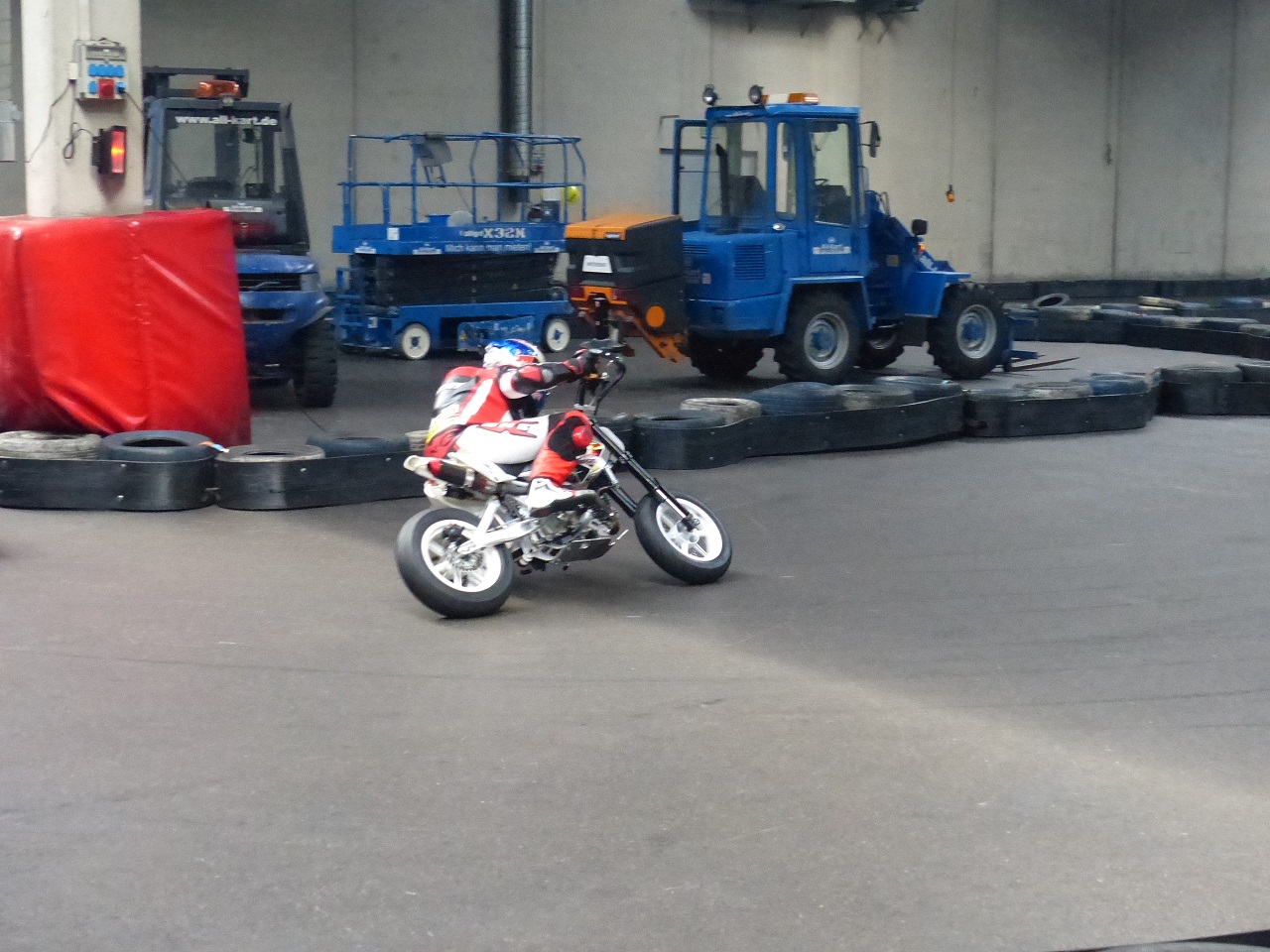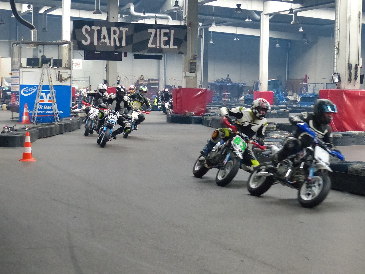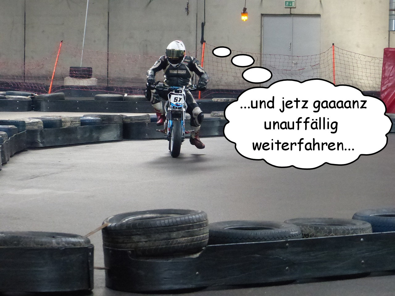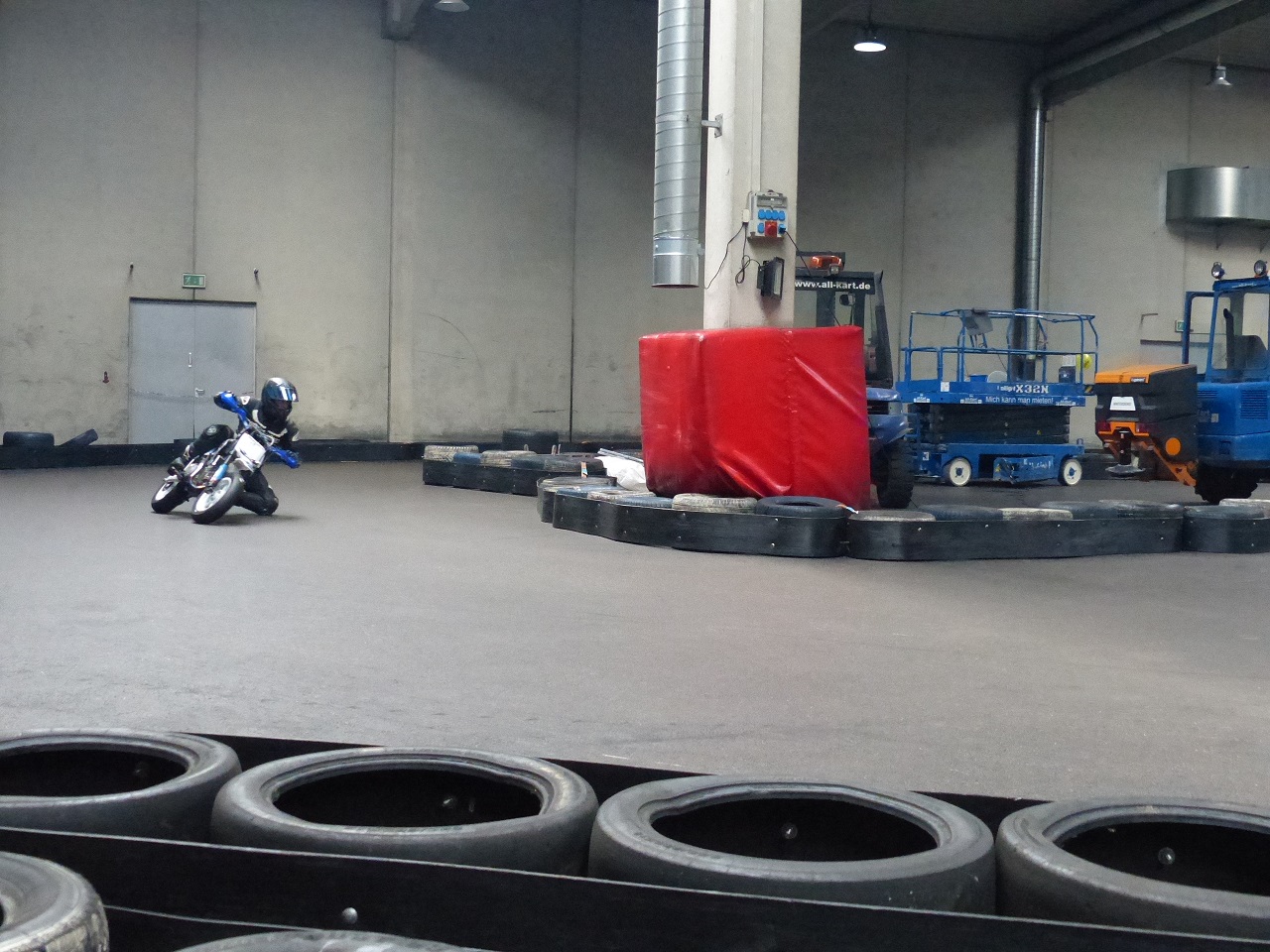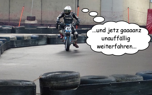 Das Rennen wurde stehend gestartet, wobei der ein oder andere wirklich stand oder nur sehr schwer in Schwung kam, aber 7-8 Pit-Bikes gemeinsam in die erste Kurve…ja doch...wie auf der Rennstrecke, nur bisschen kleiner. :D