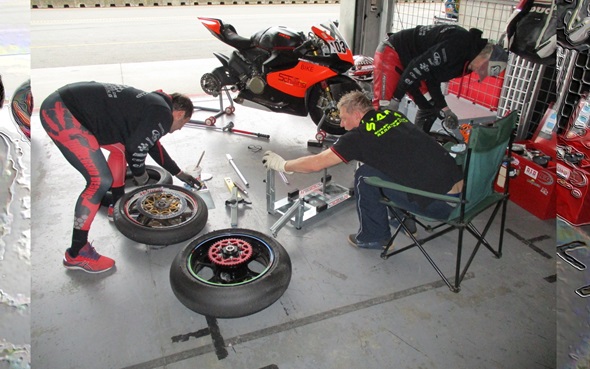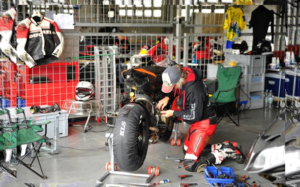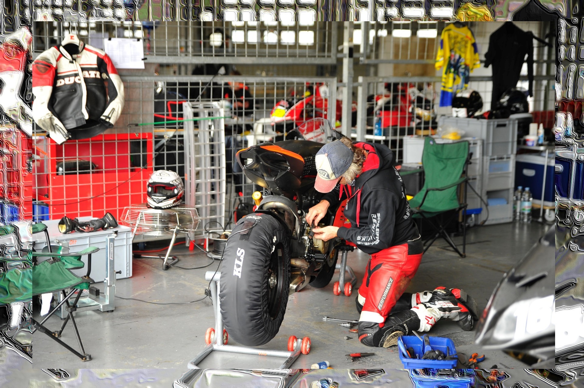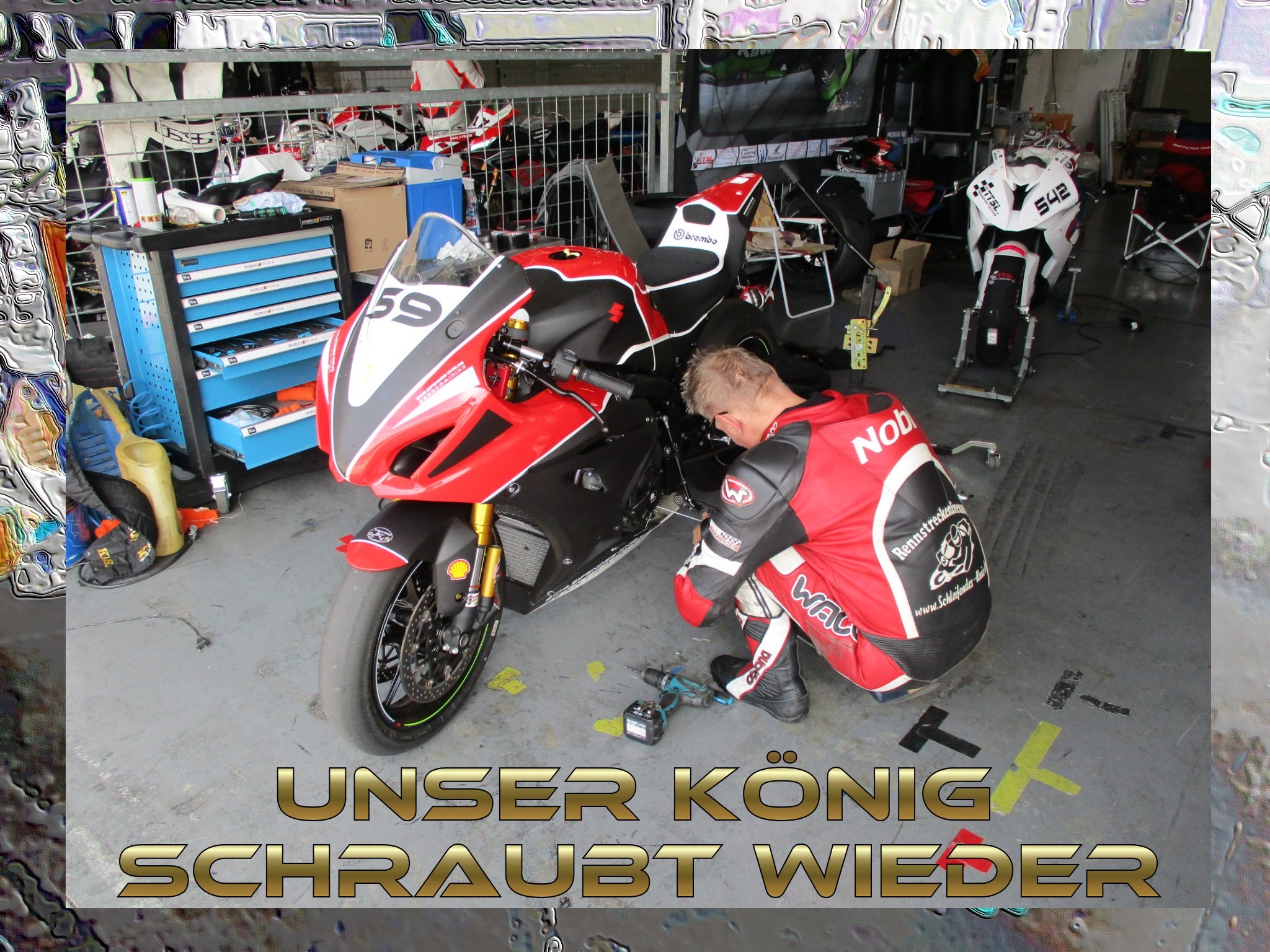 Samstags blieb es mit 12-13°C Lufttemperatur kühl, aber es konnten noch einige trockene Installations- und Einstellrunden gedreht werden, bevor es gegen 16.00 Uhr wieder anfing zu regnen. Nik nutzte die Zeit in der Box, um filigrane Justierungen an seinem Schaltgestänge mit dem „Nobbischen-Präzisionswerkzeug“ durchführen zu können.