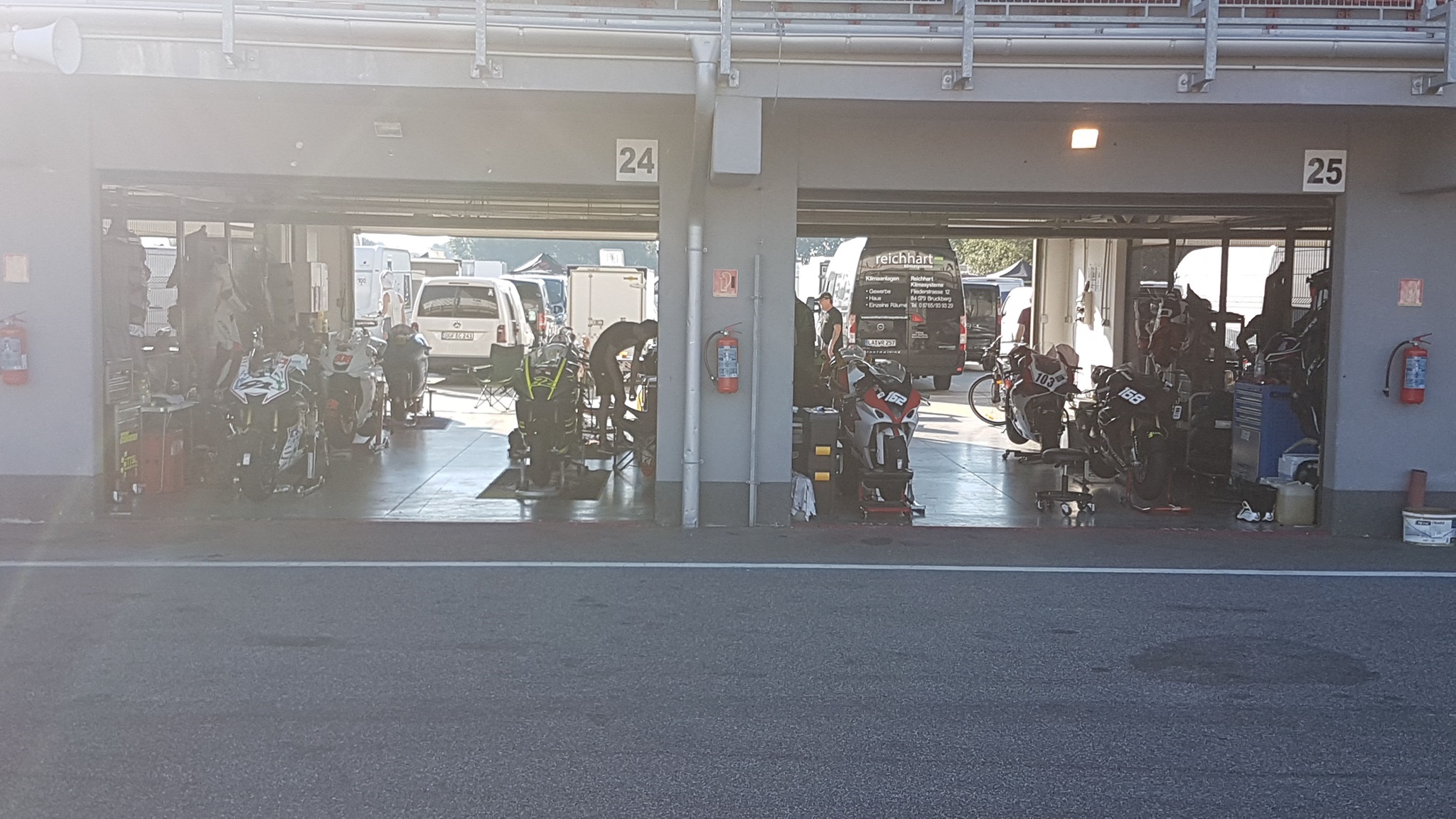 Nach der Fahrerbesprechung um 8.00 Uhr über die Lautsprecheranlage, startete der erste Turn, für die Rennstreckenneulinge auch Instruktoren geführt, bei jetzt schon 24°C. Allerdings musste dieser schon nach wenigen Minuten abgebrochen werden, da ein Teilnehmer über einige hundert Meter Öl auf der Ideallinie verlor und dieses erst entfernt, bzw. die Strecke gereinigt werden musste.