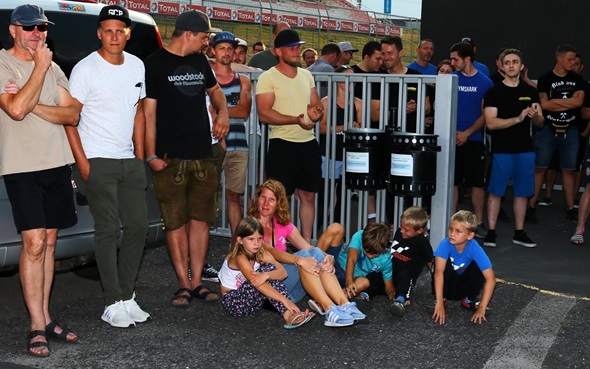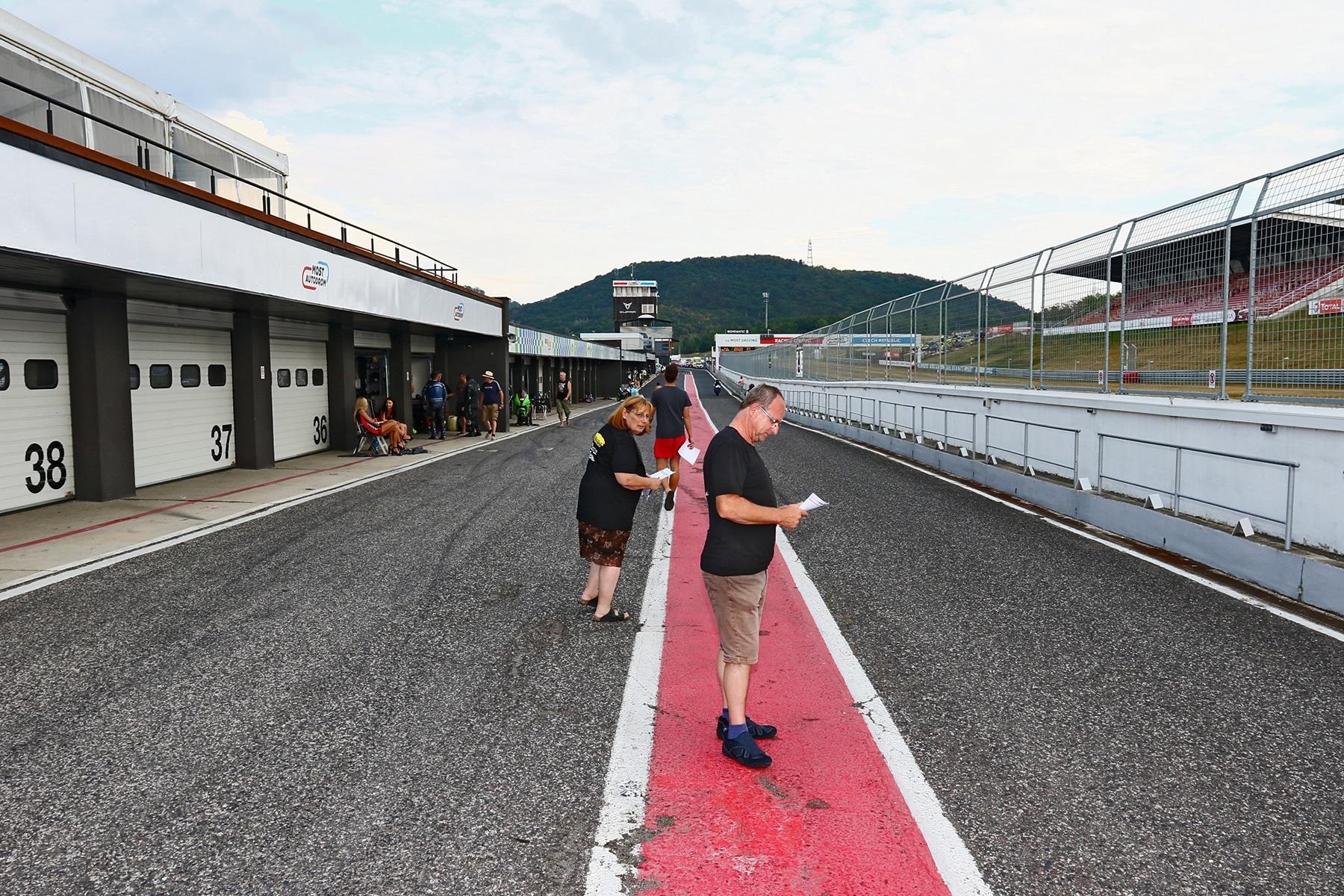 Ab 13.00 Uhr wäre die Rennstrecke wieder für alle Teilnehmer befahrbar gewesen, aber durch einen Wetterumschwung, bzw. ein leichtes Dauernieseln, warteten alle Teilnehmer ab, wie sich das Wetter weiter entwickelt. Da aber der Asphalt durch die hohen Temperaturen der letzten Tage so stark aufgeheizt war, verdunstete der Nieselregen wie Wasser auf einer heißen Ofenplatte und so dauerte es nicht lange, bis einige Unerschrockene die Gripverhältnisse testeten. Nach einiger Zeit kam auch wieder die Sonne durch die dichte Wolkendecke und so wurden es immer mehr Teilnehmer, die sich wieder auf den Track wagten.