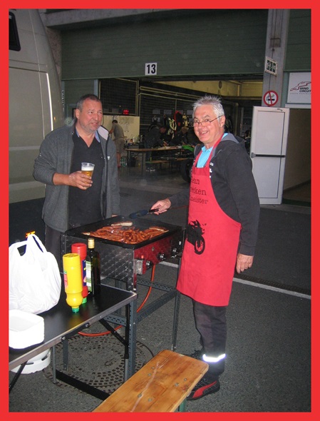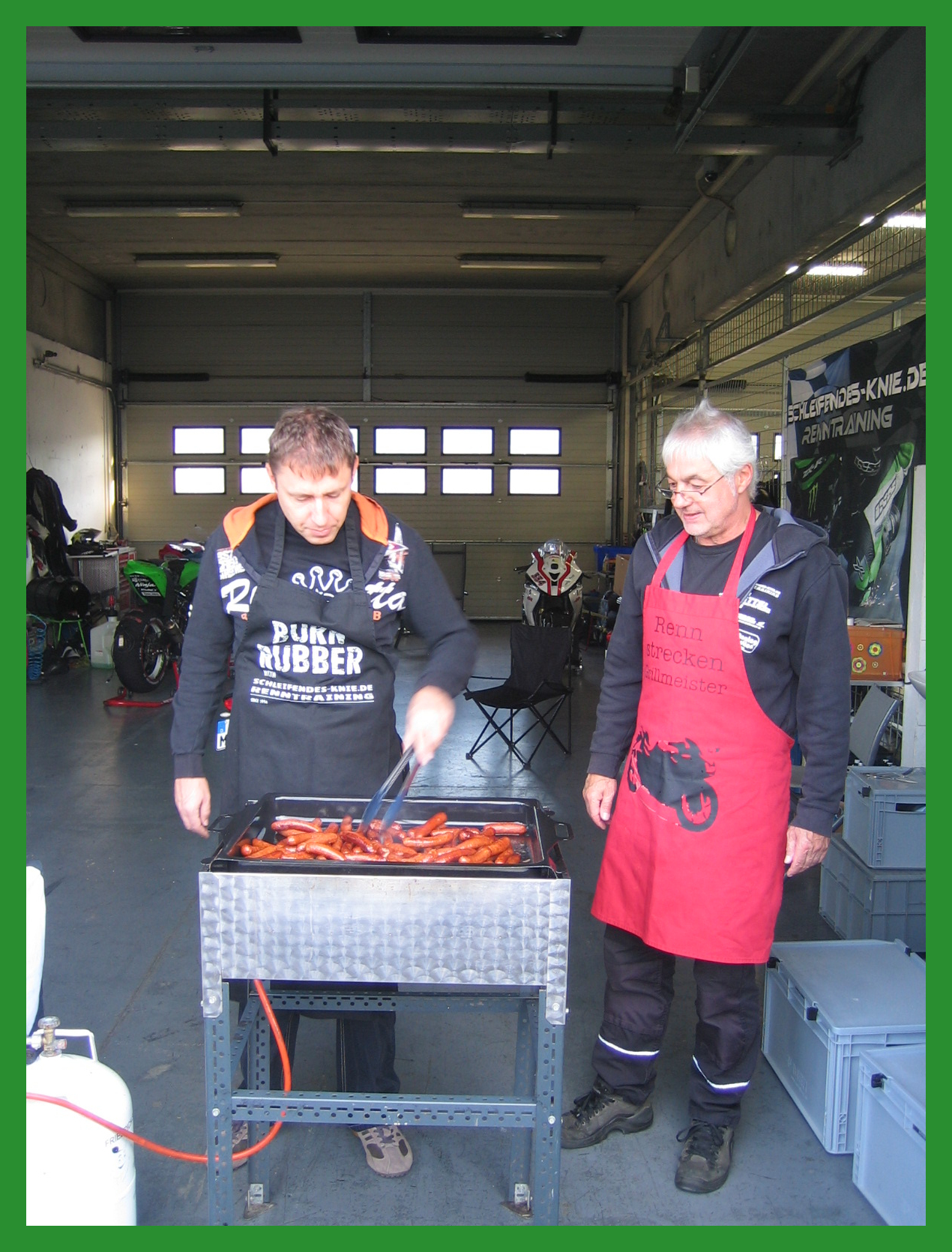 Der Regen ließ nach etwa 2 Stunden nach und die Strecke trocknete nochmal bei leichtem Sonnenschein ab. Einige Schleifer wagten sich noch auf die Strecke um für das Rennen 1 am Samstag Nachmittag eine schnelle Runde zu drehen und eine gute Startposition herauszufahren. Da sich aber auf der Strecke noch einige nasse Stellen befanden, waren Top-Zeiten nicht möglich, aber alle konnten den ersten Tag sturzfrei beenden. Am Abend ließen es sich Stefan und Bene nicht nehmen, wieder für alle Schleifer scharfe Käsewürstchen zu grillen. Mig mischte für alle Beteiligten fleißig Getränke und sorgte so für die benötigten Vitamine für die nächsten beiden Tage.